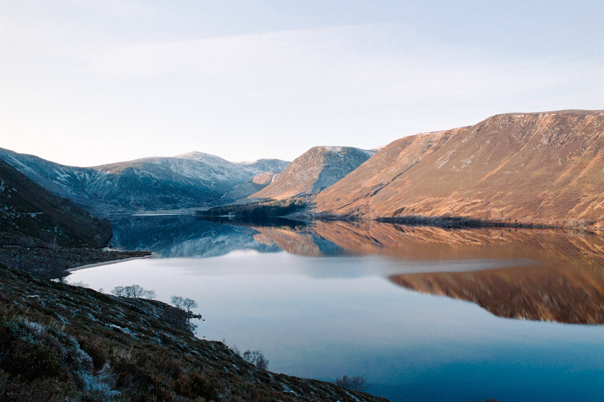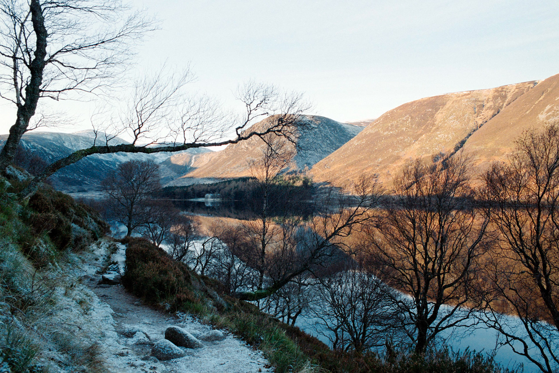 A bitterly cold hike around Loch Muick in the Cairngorms. The combination of low winter sun, clear skies, and -12°C temperatures resulted in an etherial crispy atmosphere - and cold hands.